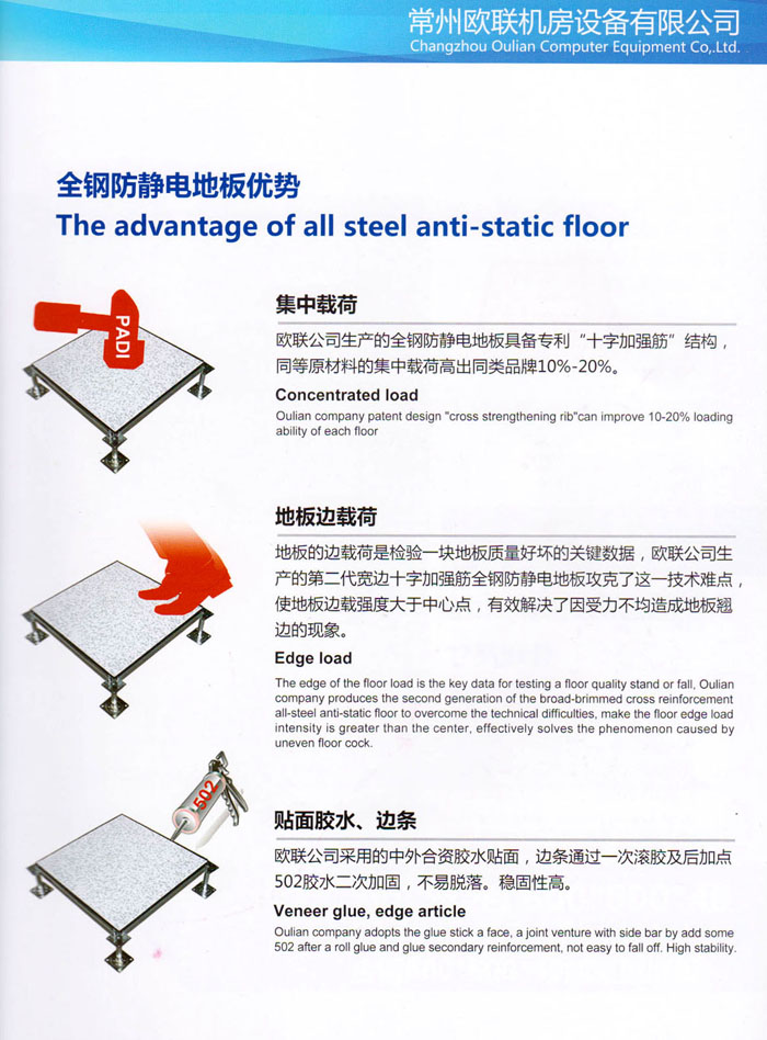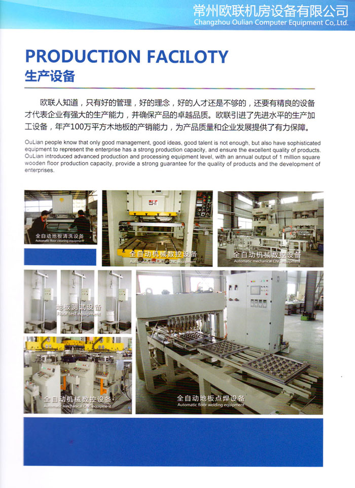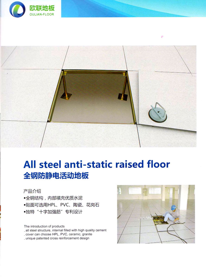 防靜電高架活動地板、全鋼地板、陶瓷地板是計算機(jī)行業(yè)發(fā)展起來的新型鋪地材料,隔離了潮氣、靜電灰塵,最重要的是解決了綜合布線問題,無需預(yù)埋管線,可隨時拆卸、搬移,保證了資訊設(shè)備完整的優(yōu)點(diǎn),適應(yīng)了智能化樓宇中信息自動化技術(shù)對所處環(huán)境的特定要求,避免了廣大客戶的雙重投資,使現(xiàn)代化辦公程度更加高效,辦公場所更加舒適。 “歐聯(lián)”系列全鋼地板,符合國家安全要求,種類完備多樣,其中防靜電陶瓷地板、硫酸鈣地板等除具有普通瓷質(zhì)的裝飾和實(shí)用性外,其耐磨、防水、防火功能優(yōu)于其它同類產(chǎn)品,防靜電系列地板,能切合不同客戶的要求,其靈活的配置,深受客戶歡迎,不同材質(zhì)的地板結(jié)構(gòu)使設(shè)計師的設(shè)計空間比傳統(tǒng)的更加廣闊自由和善變。 公司大力發(fā)展國內(nèi)外銷售業(yè)務(wù),多次中標(biāo)國內(nèi)重點(diǎn)工程 ,例:哈爾濱醫(yī)科大學(xué)、山東大學(xué)、上海普通機(jī)場等。 公司將一如既往開發(fā)和制造一流的產(chǎn)品,愿與廣大有識之士合作發(fā)展,共創(chuàng)美好未來。