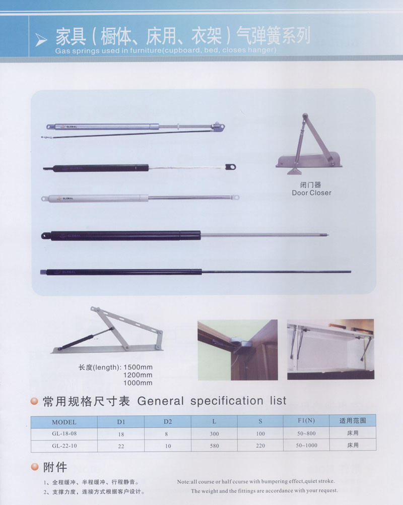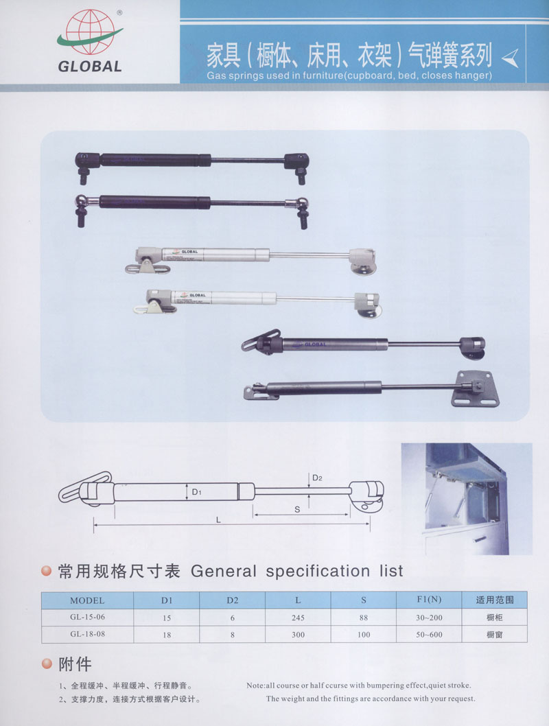 常州市全球氣彈簧有限公司坐落于高新開發(fā)區(qū)南區(qū),占地12800平方米,是專業(yè)生產用于家具,汽車,醫(yī)療設施以及工業(yè)等各類氣彈簧的廠家。公司擁有專業(yè)的技術人員和先進的設備,產品大部分出口到國外,產品的質量和性能得到內外客戶的認可和歡迎。 公司還配備了專門研究和開發(fā)新產品的技術人員以滿足不同客戶的需求。 您的關注和支持是我們不斷創(chuàng)新和發(fā)展的動力,更好的質量和服務是我們的工作理念,我們將竭誠為您服務。