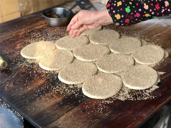 每天凌晨一兩點鐘,沈國平就要去采買當天最新鮮的豬板油,回來清理干凈,和上面粉攪拌均勻,制成面團。麻糕的制作主要由沈國平妻子和兩個姊妹來完成。揉面、搓胚子、配油酥,按餡心、搟均勻,整個過程行云流水,連貫無比。