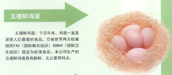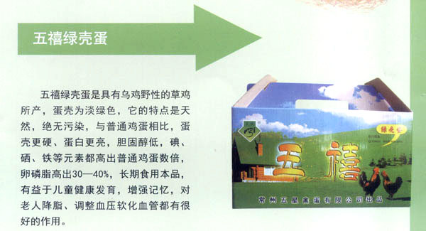 常州五星禽蛋有限公司創(chuàng)建于1990年,是常州市最大的禽蛋生產(chǎn)基地。公司秉承“辦實(shí)事、服務(wù)城市;上水平,掙創(chuàng)效益”的經(jīng)營(yíng)宗旨。注重科技開發(fā)與管理創(chuàng)新,全力打造“五禧”品牌。公司于2000年通過了ISO9002質(zhì)量體系認(rèn)證;2004年又通過了無公害雞蛋產(chǎn)地和產(chǎn)品認(rèn)證,并獲兩項(xiàng)專利。 經(jīng)多年努力實(shí)現(xiàn)了“五禧”產(chǎn)品系列化,F(xiàn)公司每年向市場(chǎng)提供有“五禧”鮮雞蛋,“五禧”土雞蛋,“五禧”ELC蛋,“五禧”綠殼草雞蛋,成為了不同消費(fèi)群體的理想選擇!拔屐钡岸啻螛s獲常州市場(chǎng)知名商標(biāo)稱號(hào)。