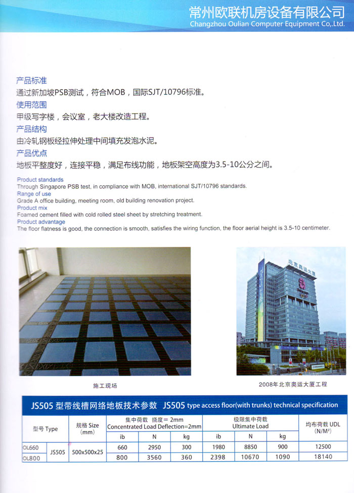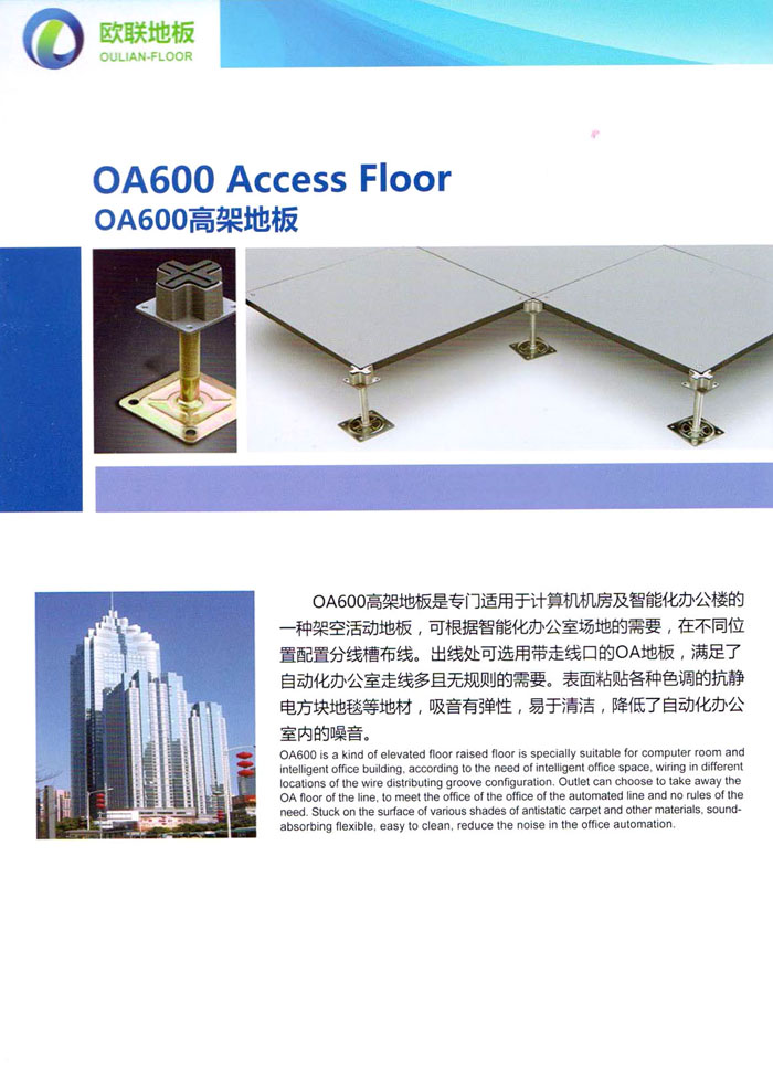 防靜電高架活動(dòng)地板、全鋼地板、陶瓷地板是計(jì)算機(jī)行業(yè)發(fā)展起來(lái)的新型鋪地材料,隔離了潮氣、靜電灰塵,最重要的是解決了綜合布線問題,無(wú)需預(yù)埋管線,可隨時(shí)拆卸、搬移,保證了資訊設(shè)備完整的優(yōu)點(diǎn),適應(yīng)了智能化樓宇中信息自動(dòng)化技術(shù)對(duì)所處環(huán)境的特定要求,避免了廣大客戶的雙重投資,使現(xiàn)代化辦公程度更加高效,辦公場(chǎng)所更加舒適。 “歐聯(lián)”系列全鋼地板,符合國(guó)家安全要求,種類完備多樣,其中防靜電陶瓷地板、硫酸鈣地板等除具有普通瓷質(zhì)的裝飾和實(shí)用性外,其耐磨、防水、防火功能優(yōu)于其它同類產(chǎn)品,防靜電系列地板,能切合不同客戶的要求,其靈活的配置,深受客戶歡迎,不同材質(zhì)的地板結(jié)構(gòu)使設(shè)計(jì)師的設(shè)計(jì)空間比傳統(tǒng)的更加廣闊自由和善變。 公司大力發(fā)展國(guó)內(nèi)外銷售業(yè)務(wù),多次中標(biāo)國(guó)內(nèi)重點(diǎn)工程 ,例:哈爾濱醫(yī)科大學(xué)、山東大學(xué)、上海普通機(jī)場(chǎng)等。 公司將一如既往開發(fā)和制造一流的產(chǎn)品,愿與廣大有識(shí)之士合作發(fā)展,共創(chuàng)美好未來(lái)。