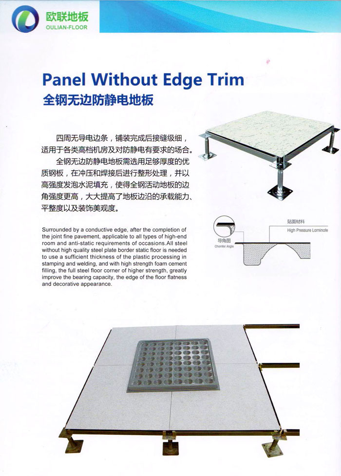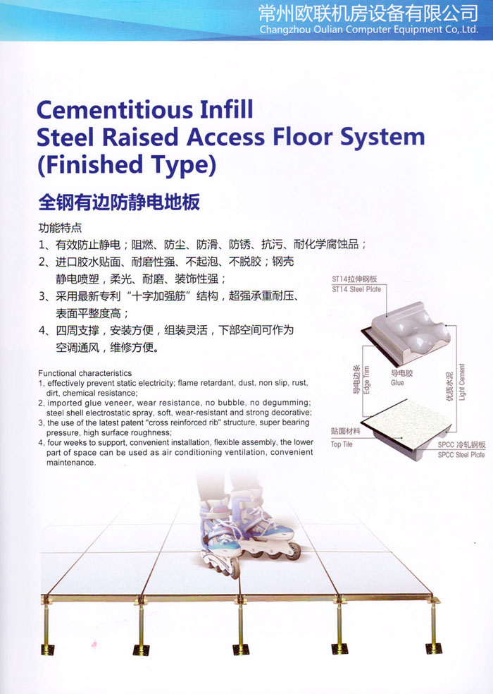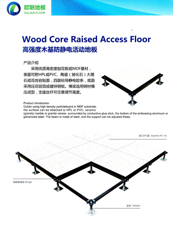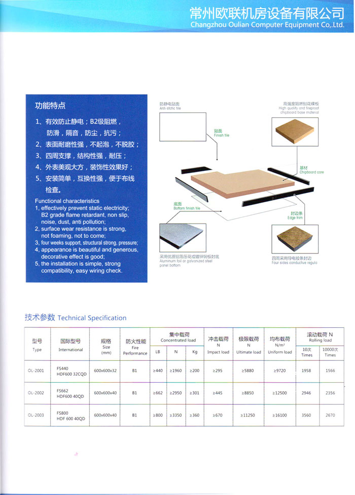 防靜電高架活動地板、全鋼地板、陶瓷地板是計算機行業(yè)發(fā)展起來的新型鋪地材料,隔離了潮氣、靜電灰塵,最重要的是解決了綜合布線問題,無需預(yù)埋管線,可隨時拆卸、搬移,保證了資訊設(shè)備完整的優(yōu)點,適應(yīng)了智能化樓宇中信息自動化技術(shù)對所處環(huán)境的特定要求,避免了廣大客戶的雙重投資,使現(xiàn)代化辦公程度更加高效,辦公場所更加舒適。 “歐聯(lián)”系列全鋼地板,符合國家安全要求,種類完備多樣,其中防靜電陶瓷地板、硫酸鈣地板等除具有普通瓷質(zhì)的裝飾和實用性外,其耐磨、防水、防火功能優(yōu)于其它同類產(chǎn)品,防靜電系列地板,能切合不同客戶的要求,其靈活的配置,深受客戶歡迎,不同材質(zhì)的地板結(jié)構(gòu)使設(shè)計師的設(shè)計空間比傳統(tǒng)的更加廣闊自由和善變。 公司大力發(fā)展國內(nèi)外銷售業(yè)務(wù),多次中標國內(nèi)重點工程 ,例:哈爾濱醫(yī)科大學、山東大學、上海普通機場等。 公司將一如既往開發(fā)和制造一流的產(chǎn)品,愿與廣大有識之士合作發(fā)展,共創(chuàng)美好未來。
