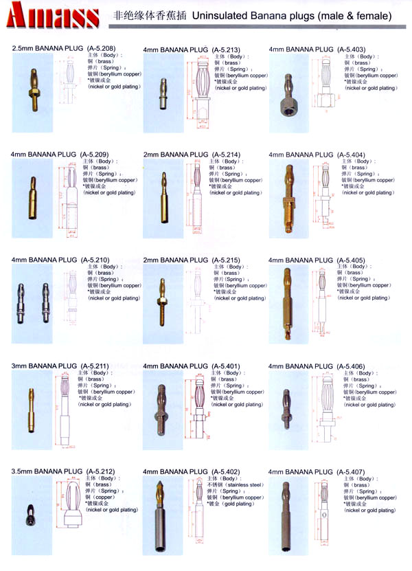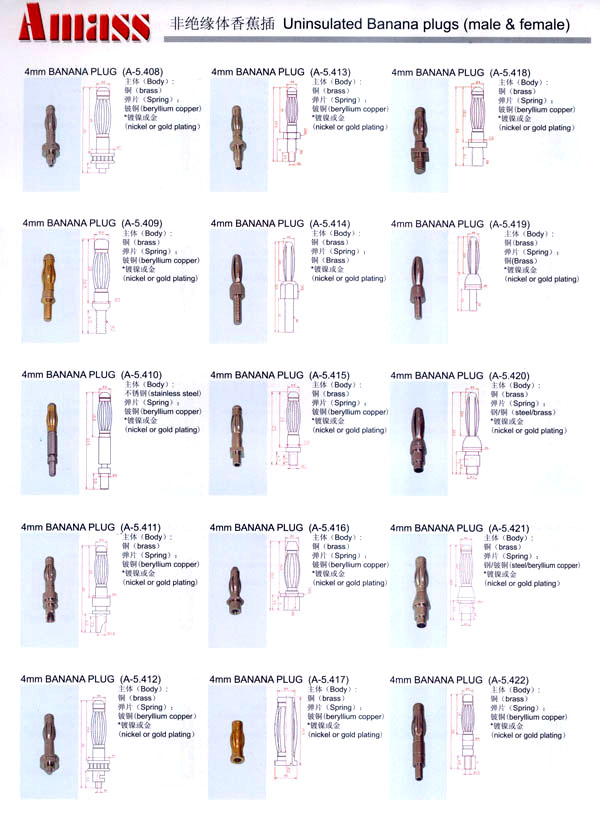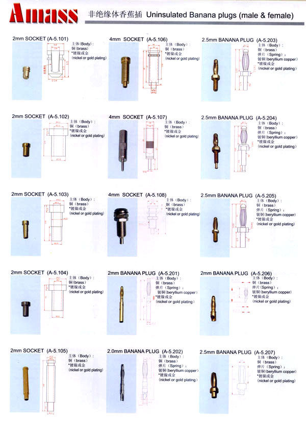 本公司專業(yè)生產(chǎn)各類香蕉插頭,香蕉插座,接線柱,電瓶夾,鱷魚夾,測試導(dǎo)線,測試筆等。產(chǎn)品分2mm/2.5mm/3mm/3.5mm/4mm五大系列,百余種款式, 各種香蕉插廣泛用于儀器、儀表、電力測試、教學(xué)、玩具,視聽設(shè)備、醫(yī)療儀器,保健產(chǎn)品等領(lǐng)域。公司技術(shù)力量雄厚,生產(chǎn)工藝先進(jìn),產(chǎn)品遠(yuǎn)銷港、臺、歐美,并與飛利浦等國際品牌配套。公司本著精益求精的理念,歡迎新老客戶光臨。 我們擁有資深的工程師和豐富的電子產(chǎn)品銷售經(jīng)驗,專業(yè)生產(chǎn)各類電子接插件產(chǎn)品。 香蕉插頭,香蕉插座,電瓶夾,鱷魚夾等品種齊全、 質(zhì)量可靠,致力服務(wù)于通訊、數(shù)據(jù)通信、消費類電子產(chǎn)品、計算機(jī)和計算機(jī)外圍設(shè)備以及工業(yè)應(yīng)用等領(lǐng)域,能給客戶提供全面采購解決方案。 我們秉承穩(wěn)健作風(fēng)、誠實經(jīng)營、合理價格、完善服務(wù)的宗旨,在全體客戶的支持下,公司不斷創(chuàng)新進(jìn)取,業(yè)績蒸蒸日上,已與數(shù)十家電子零件制造商及其分支機(jī)構(gòu)建立密切合作關(guān)系,在國內(nèi)擁有數(shù)百家固定客戶。